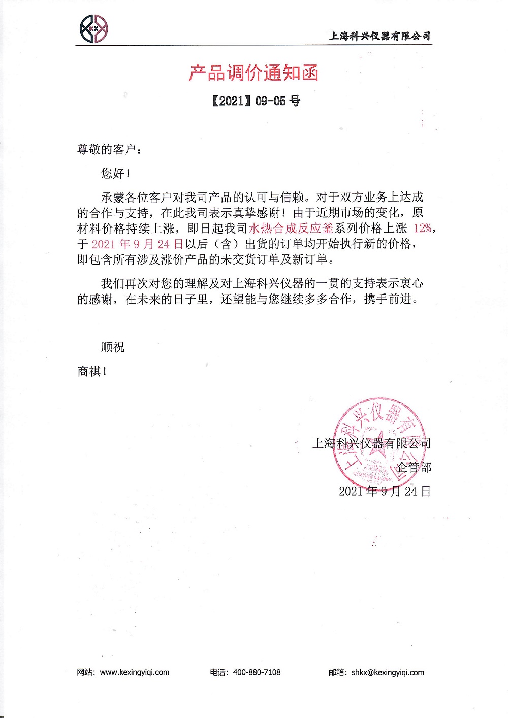 承蒙各位客戶對(duì)我司產(chǎn)品的認(rèn)可與信賴。對(duì)于雙方業(yè)務(wù)上達(dá)成的合作與支持,在此我司表示真摯感謝!由于近期市場(chǎng)的變化,原材料價(jià)格持續(xù)上漲,即日起我司水熱合成反應(yīng)釜系列價(jià)格上漲 12%,于 2021 年 9 月 24 日以后(含)出貨的訂單均開(kāi)始執(zhí)行新的價(jià)格,既包含所有涉及漲價(jià)產(chǎn)品的未交貨訂單及新訂單。